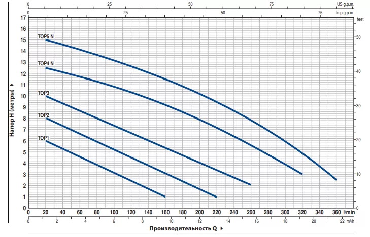Графические характеристики дренажного насоса PEDROLLO TOP 5