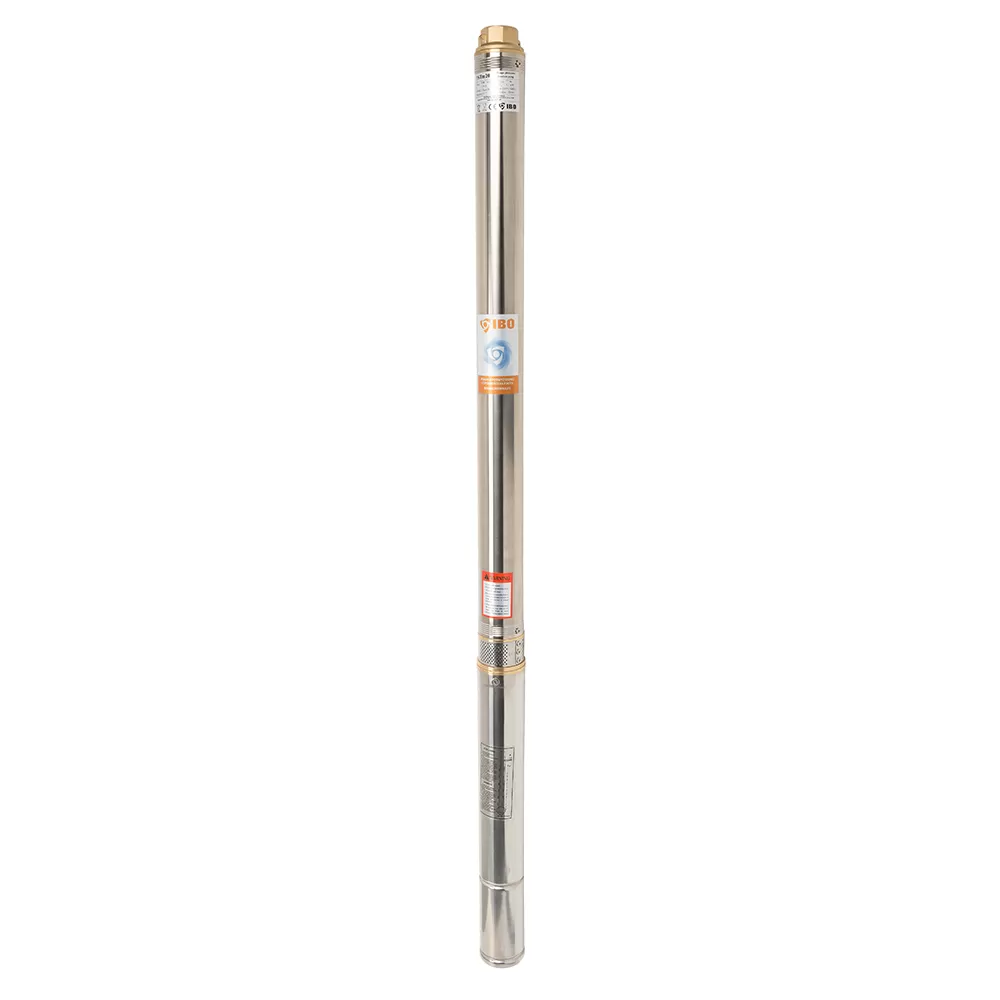 Многоступенчатые скважинный насосы диаметром 75 мм с повышенной устойчивостью к песку, рассчитанные на 3 и 4–дюймовые скважины. Насос IBO 3STM 24 обладает повышенной эффективностью к содержанию песка в перекачиваемой жидкости. Устойчивость к песку был достигнут благодаря использованию «плавающих лопастных колес» и выбору износостойких материалов. Скважинный насос IBO 3STM 24 обладает отменными характеристиками для насоса с небольшим диаметром. Максимальный напор насоса ИБО составляет 93 м, при этом максимальная производительность в пиковой точки показывает 6 м³/час. При таких напорно-расходных характеристиках мощность двигателя составляет всего 1100 Вт. Конденсатор насоса встроен в двигатель, благодаря чему электрическая установка намного проще, чем в случае насосов со стартовой коробкой. Насос оснащен тепловой защитой, установленной в обмотке двигателя. Насос комплектуется кабелем 1 м. Основным преимуществом насоса IBO 3STM 24 является чрезвычайно высокая производительность для насоса диаметром 75 мм со скоростью до 6 м³/час.