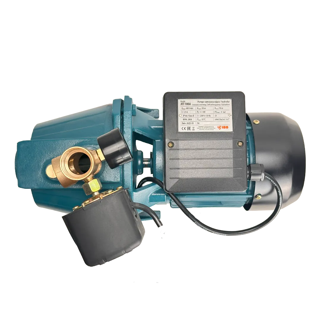 Поверхностный насос IBO JET 100A из серии JET предназначен для водоснабжения и имеет мощность 1100 Вт. Максимальный напор составляет 50 м, а максимальный расход составляет 3.6 м³/час. Номинальная производительность насоса равна 0.9 м³/час при номинальном напоре 12.5 м. Он работает от сети 220 В с силой тока 4.5 А и имеет длину кабеля 0.5 м. Насос имеет поверхностный тип установки и корпус из чугуна. Материал крыльчатки - норил. Диаметр всасывающего и напорного патрубков составляет 1 дюйм. Габариты насоса: длина - 390 мм, высота - 200 мм, ширина - 180 мм, вес - 11.5 кг. Режим работы насоса - S1, а частота тока 50 Гц. Класс защиты насоса - IP44/B. Температура перекачиваемой жидкости должна быть в диапазоне от 1 до 35 градусов Цельсия, а качество воды - чистое. Насос имеет срок службы 5 лет и гарантийный срок 1 год.