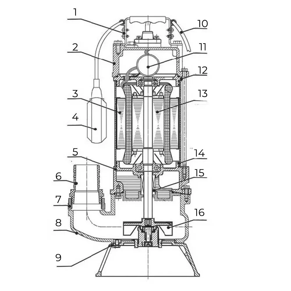 Представленный насос является типичным моноблочным агрегатом, который состоит из гидравлической части и электродвигателя. Электродвигатель, который используется здесь, является однофазным асинхронным электродвигателем с пусковым конденсатором. Он размещен в закрытом от попадания жидкости кожухе, что обеспечивает безопасность работы и продлевает срок службы двигателя. Наличие рукоятки на верхней части кожуха упрощает переноску и подвешивание насоса. Рабочее колесо закреплено на конце вала электродвигателя и отвечает за создание потока жидкости. Для предотвращения блокировки рабочего колеса волокнистыми включениями, вал двигателя оснащен вращающимся ножом, который измельчает эти включения.