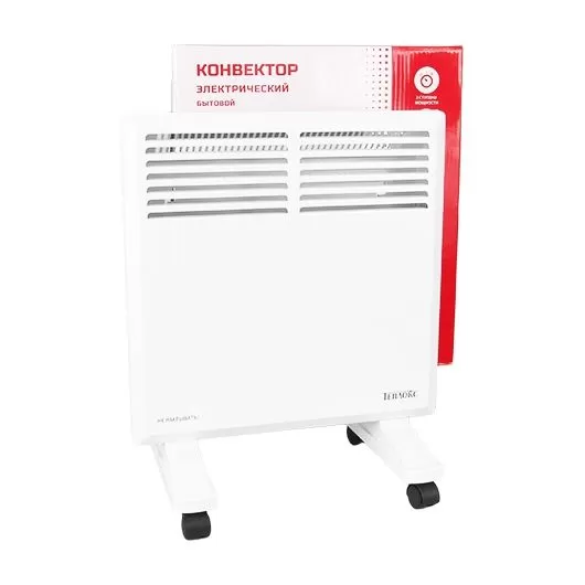Внутри корпуса в нижней части расположен Х - образный алюминиевый радиатор, внутри которого установлен нагревательный элемент (ТЭН). ТЭН имеет 2 режима мощности нагрева в зависимости от модели конвектора. Изменение мощности нагрева производится путем включения кнопок. Возможно включение как только первой кнопки, так и только второй кнопки, а при включении обеих кнопок мощность нагрева суммируется. В каждую из кнопок встроен индикатор работы (светодиод) нагревательного элемента. Регулировка температуры нагрева производится путем поворота ручки регулировки температуры. Конвектор электрический ТЕПЛОКС укомплектован колесами роликового типа для передвижения по полу в помещении и креплением для подвешивания на стену.