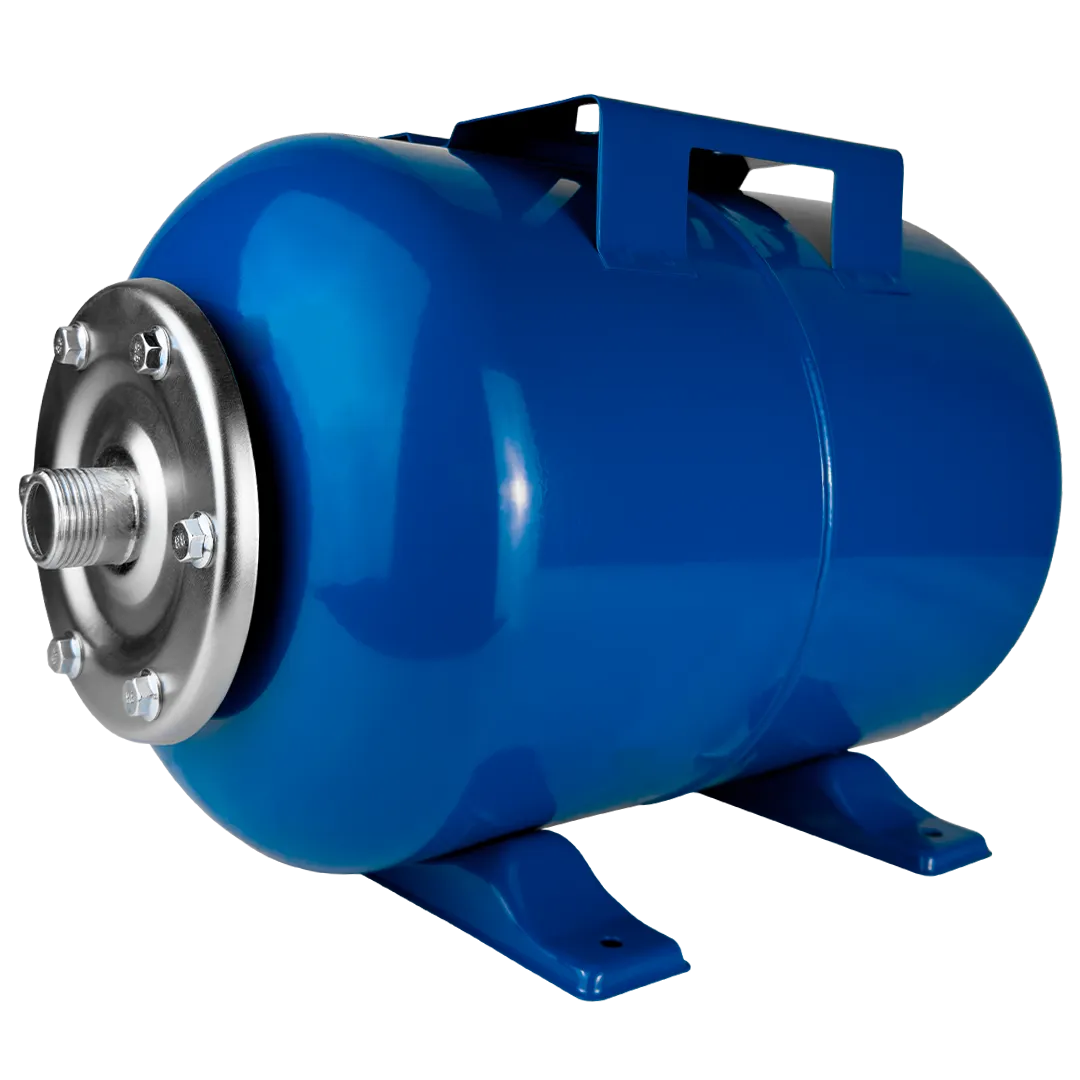 Гидроаккумулятор для воды MAXPUMP H-100 горизонтального исполнения предназначен для систем холодного водоснабжения. Гидроаккумулятор служит для накапливания запаса воды объемом до 100 литров, снижения верятности возникновения гидравлических ударов в системе, а также сокращения количества пусков насоса, тем самым продлевая срок службы насоса. Конструкция гидроаккумулятора представляет собой стальной корпус, окрашенный в синий цвет, со сменной мембранной, изготовленной из высококачественного материала EPDM, опорными ножками у основания бака, воздушным клапаном и площадкой для установки насоса. Горизонтальные гидроаккумуляторы, благодаря установочной площадке, расположенной на поверхности бака, могут использоваться с поверхностными насосами.