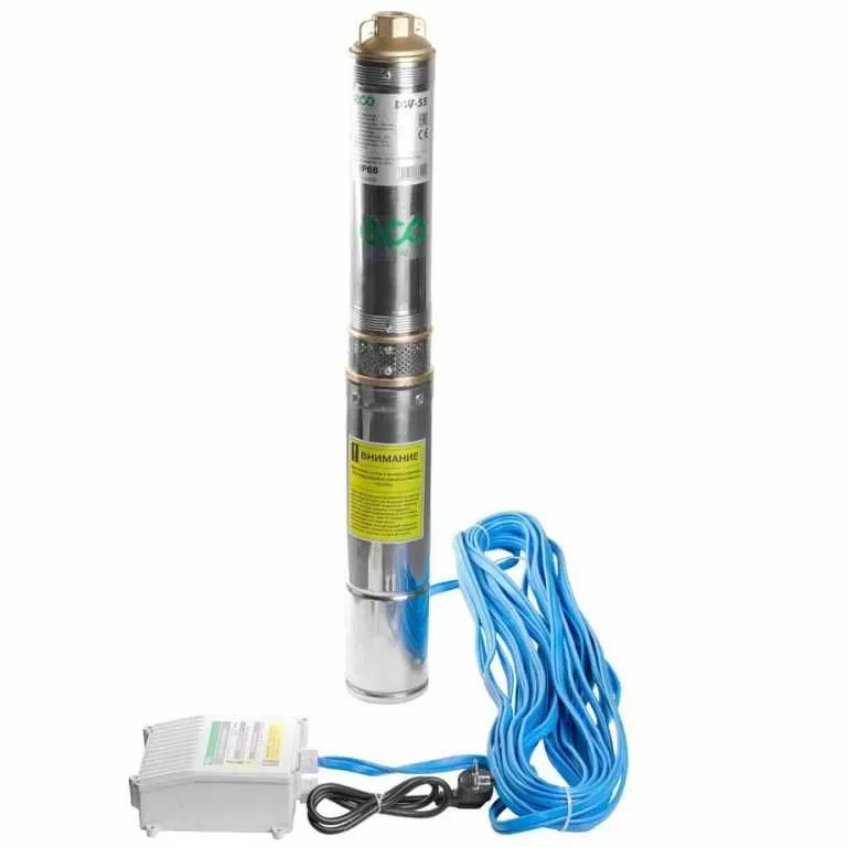 Асинхронный маслозаполненный двигатель с медной обмоткой имеет высокий ресурс и не требует технического обслуживания на протяжении всего срока службы. Крыльчатки насоса, имеют специальную форму лопастей, для повышения производительности. Блок управления содержит пусковой конденсатор и высокоскоростную тепловую защиту. Корпус насоса изготовлен из нержавеющей стали а соединительные элементы из латуни, что позволяет полностью исключить появление коррозии. В комплект входит: скважинный насос - 1 шт., блок управления - 1 шт, сетевой кабель - 20м.