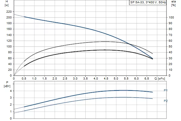 Насос Grundfos SP 5A-33 создан с применением новейших гидравлических технологий. Grundfos SP 5A-33 созданные специально для того, чтобы обеспечивать максимальную эффективность в периоды высокой нагрузки, насос имеет низкую стоимость и высокую надёжность эксплуатации вне зависимости от вида назначения. Grundfos SP 5A-33 обеспечивает высокую эффективность, высокое сопротивление абразивному износу (песку и иным абразивам), защиту от перегрева двигателя и простоту технического обслуживания. Также доступна готовая к применению система контроля и управления, предназначенная для постоянной оптимизации работы насосной системы. Максимальная производительность насоса 7 м3/час, максимальный напор 210 м при мощности электродвигателя 3000 Вт. Насос работает от сети 380 в. Гарантийный срок на насос Grundfos SP 5A-33 составляет 2 года.