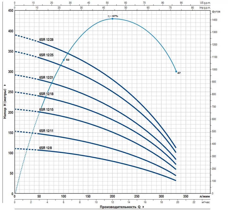 Глубинный насос Pedrollo 6SR12/25-P, отличается объективной ценой и надежной работой всех исполнительных механизмов. Насос Pedrollo 6SR12/25-P достаточно простой в эксплуатации и обслуживании, поэтому отлично подходит как для домашнего, так и промышленного применения.В основе работы Pedrollo 6SR12/25-P лежит конструктивно простой, но функционально успешный многоступенчатый центробежный принцип. Электрический двигатель подключается к агрегату через суппорт, в соответствии с нормативами международного стандарта NEMA. Мощность электродвигателя насоса составляет 13000 Вт . И при таких показателях мощности насос обладает максимальным напором в 349 метров и максимальной производительностью 19.8 м3/час. Функционирование Pedrollo 6SR12/25-P идентично большинству устройств, основанных на центробежных механизмах подачи воды. Жидкость втягивается в корпус устройства благодаря центробежной силе, создаваемой рабочими колесами, которые также проталкивают воду через все тело насоса "диаметр насоса 6"", а затем в нагнетающий патрубок "диаметр патрубка 3"", через который вода и попадает к конечному потребителю. Главной особенностью насоса Pedrollo 6SR12/25-P является малый диаметр корпуса агрегата, а также то, что перекачиваемая вода не касается стенок двигателя. Между жидкостью и корпусом движущей установки располагается прослойка из технологического масла, которая и предотвращает попадание мелких частиц непосредственно в исполнительный механизм. В то время как охлаждение электропривода происходит за счет верхнего способа забора воды, т.е. перекачиваемая жидкость находится всегда выше уровня расположения двигателя. Насос питается от сети в 380 в и комплектуется кабелем 4 метров.