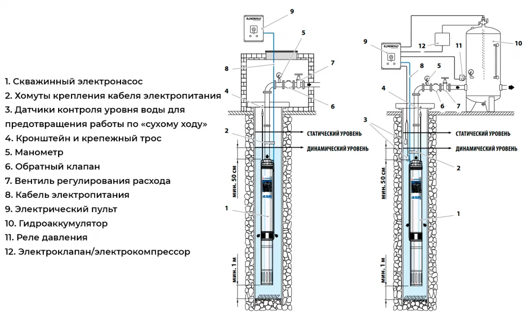 - Датчики контроля уровня воды для предотвращения работы по «сухому ходу»