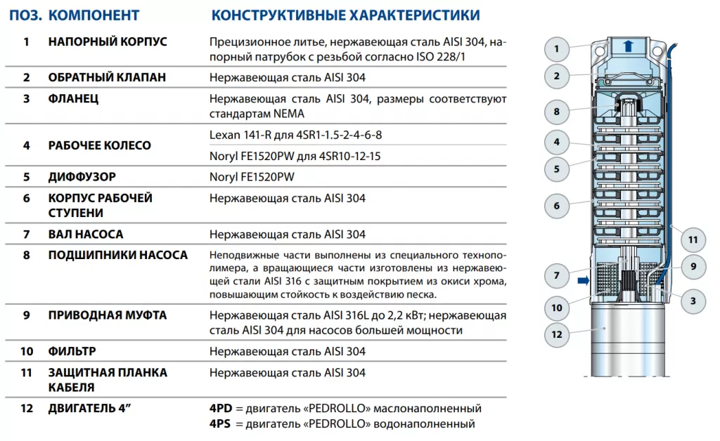 Устройство насоса Pedrollo 6SR27/27-P: