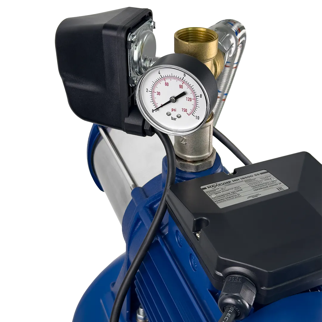 Комплект (Поверхностный насос MAXPUMP MH 1800D SS рабочие колеса из нержавеющей стали, Горизонтальный бак MAXPUMP 24л, Реле давления Italtecnica РМ/5 G14, Пятипозиционный латунный штуцер MAXPUMP, манометр особопрочный MAXPUMP B32-3/T D 63 мм 1/4" аксиальный, Подводка гибкая Italtecnica FAF1060MFC 1" 60 см, Ниппель 1 1/4"х 1", Муфта 1")